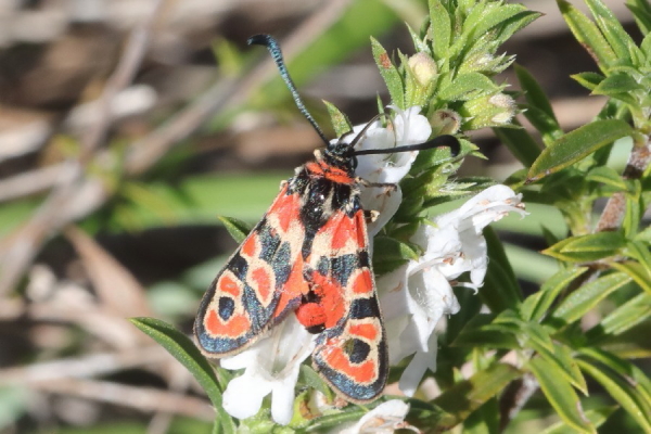 Nur noch selten zu sehen: Das Bergkronwicken-Widderchen. Die roten Flecken sind gelb eingefasst. Im Verhätnis zu anderen Widderchen ist diese Art relativ klein.