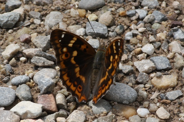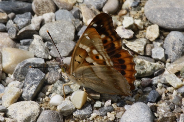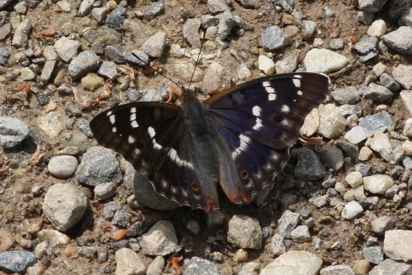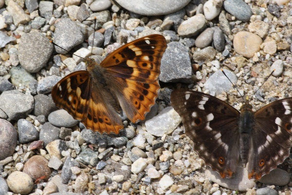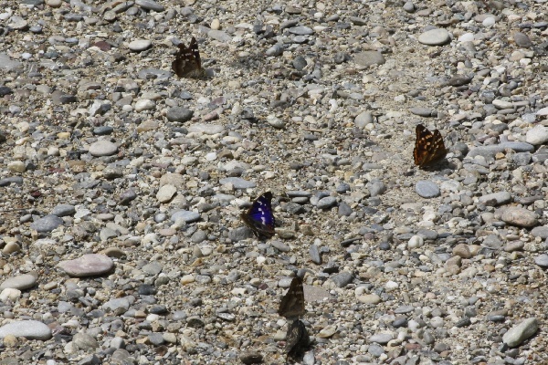 Häufig sitzen gleich mehrere Schillerfalter an feuchten Wegstellen oder Tierkot, um zu saugen. Auf diesem Bild sind beide Formen des Kleinen Schillerfalters vertreten.