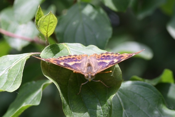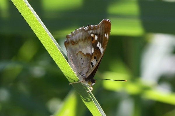 Dieses Männchen hat sich startbereit auf einem Blatt niedergelassen. Den Schiller zeigen bei allen Schillerfalterarten nur die Männchen.
