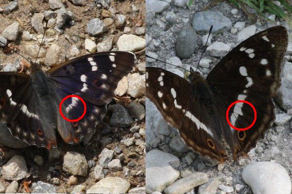 Das sicherste Unterscheidungsmerkmal vom Großen Schillerfalter (Apatura iris) ist nicht die Größe, sondern der dem Kleinen Schillerfalter fehlende, nach außen weisende "Zahn" in der weißen Hinterflügelbinde. Links der Kleine, rechts der Große Schillerfalter.