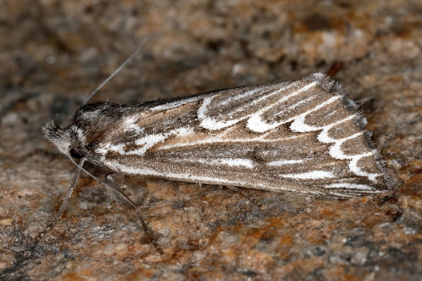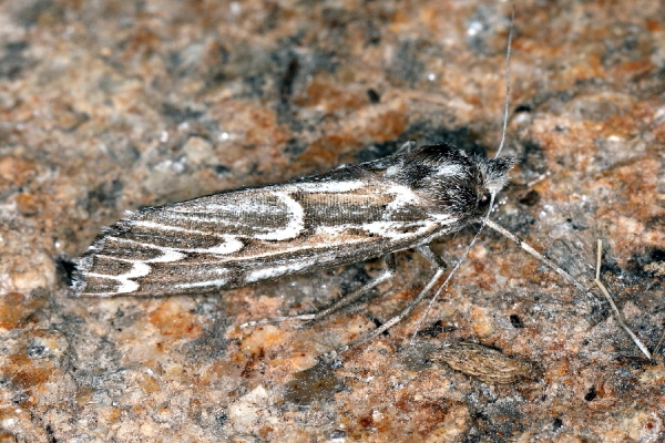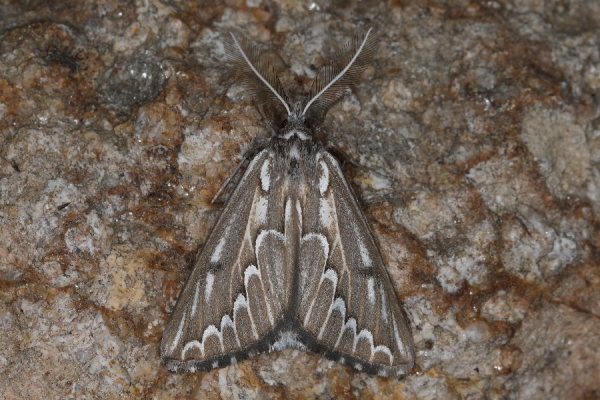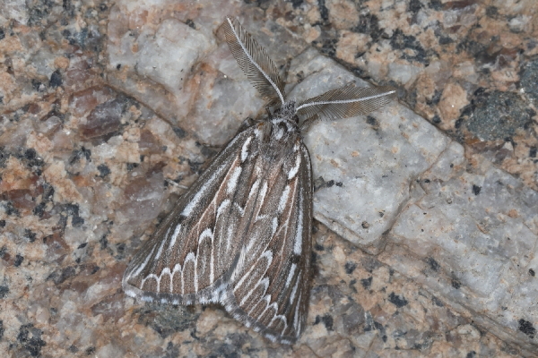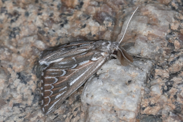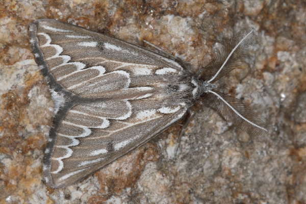 Derselbe Falter. Die Männchen haben stark gefiederte Fühler.